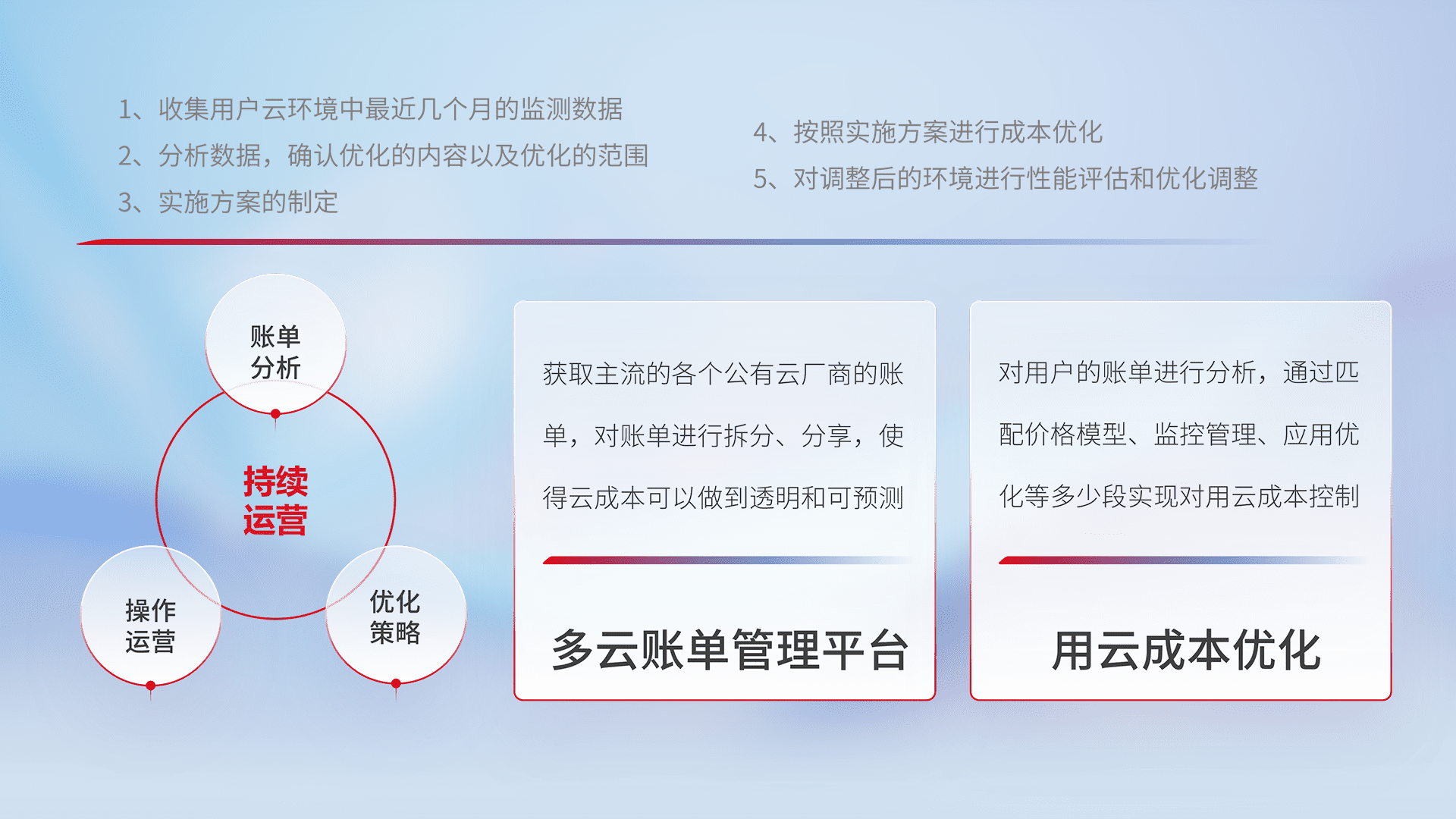 通过多云纳管,,,以统一的资源数据模型把客户的云资源进行抽象和封装,,,进而实现对多云资源的统一操作,,保障云资源管理的可靠性、、、稳定性与可用性。。量身定制化运维内容,,配置、、、开发运维、、、补丁管理、、、备份、、、监控、、认证和访问管理、、审计和日常巡检等,,,保障在用云过程中的可靠度,,稳定度以及高可用率。。。
