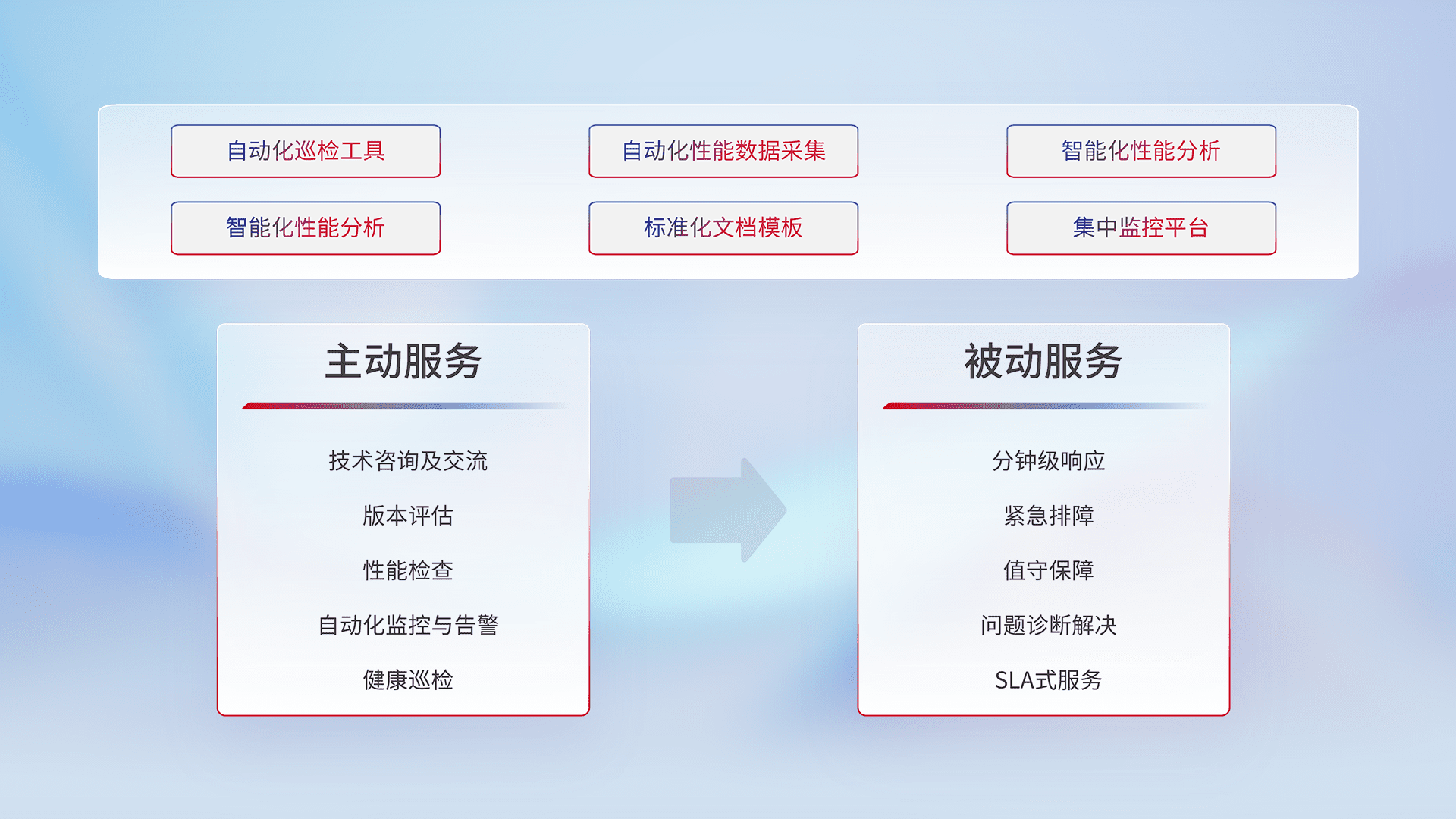 智能化工具和标准化文档,,保障服务质量,,提供主动服务(包含技术咨询、、、版本评估、、、性能检查、、、自动化监控与告警、、、、健康巡检)和被动服务包含(分钟级响应、、紧急排障、、值守保障、、问题诊断解决、、、SLA服务)。。
